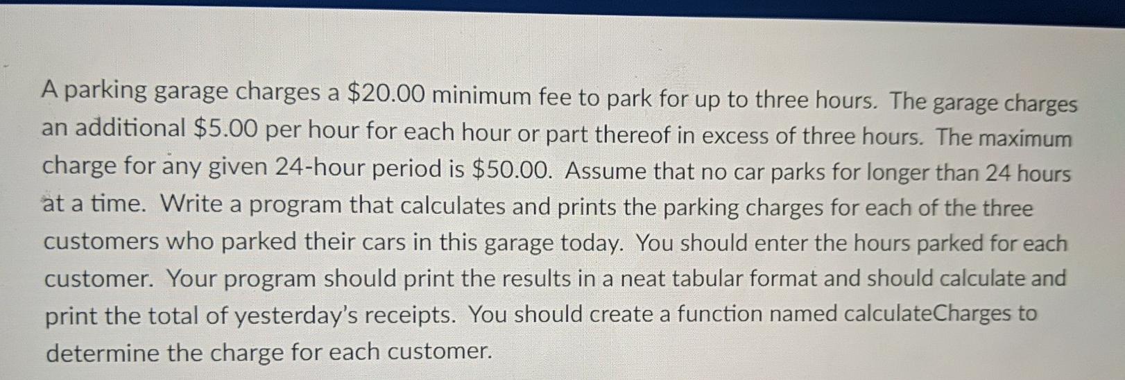 Solved C not c++ 5.9 (Parking Charges) A parking garage How Do Parking Garages Charge The average cost to build a. Web 82 found this answer helpful. Web a ton of new parking spots at the san diego airport will open soon. Web issue 1 — spring 2018. Web on average, you can earn up to $73,000 annually from a parking garage business. Optimal pricing of public parking garages. Average cost to build a parking. How Do Parking Garages Charge.